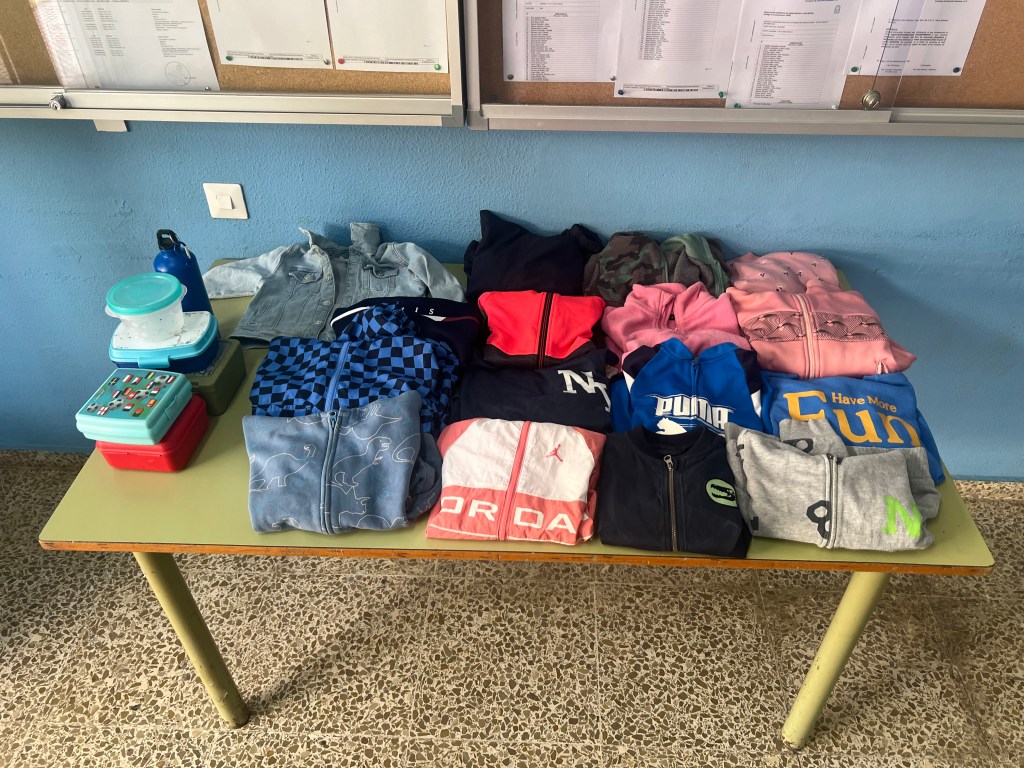 Hasta el próximo jueves, podrán recoger las prendas perdidas por sus hijos/as en el hall de secretaría. El lunes de la próxima semana llamaremos a Cruz Roja para entregarle toda esa ropa como donativo. Algunas de estas prendas llevan semanas perdidas y nadie las reclama. COMO SUGERENCIA, IDENTIFIQUEN LAS PRENDAS DE SUS HIJOS/AS, SOBRE TODO DE LOS MÁS PEQUEÑOS. Entre toda esta ropa, tuppers y botellas, hay artículos recogidos del Aula Matinal. Gracias!