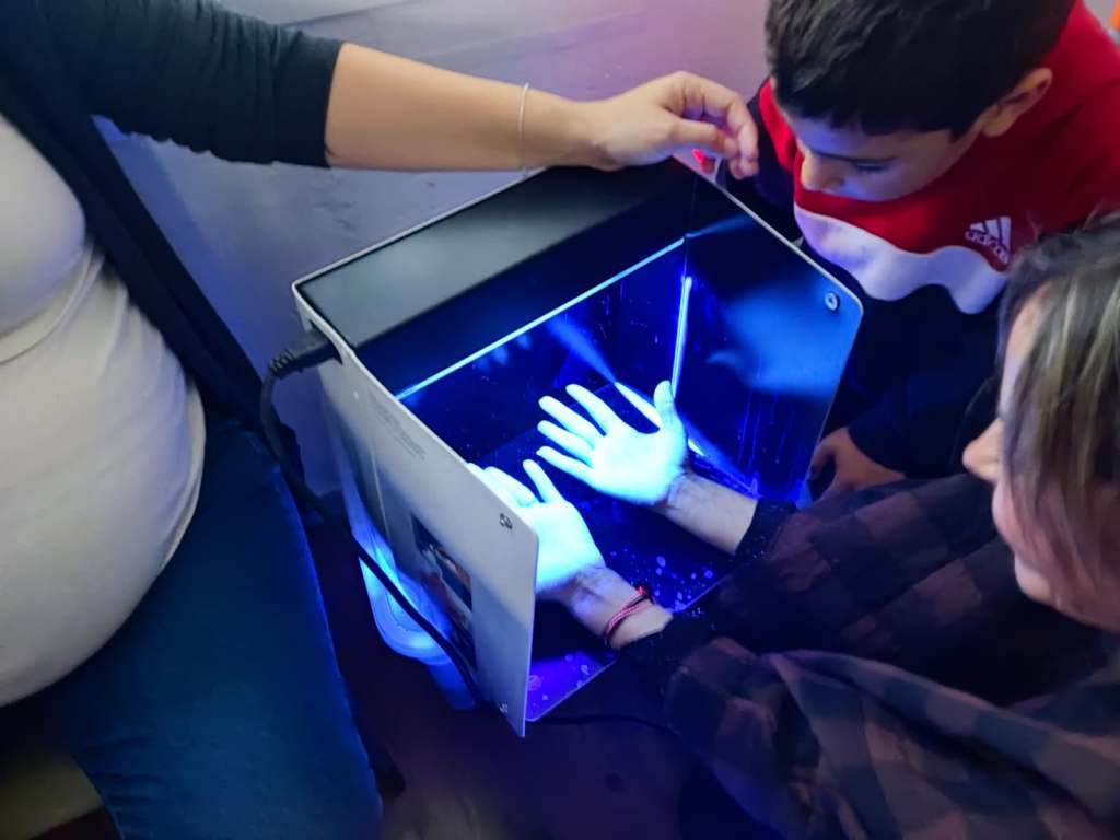 Con la luz ultravioleta vemos si tenemos bien limpias las manos.