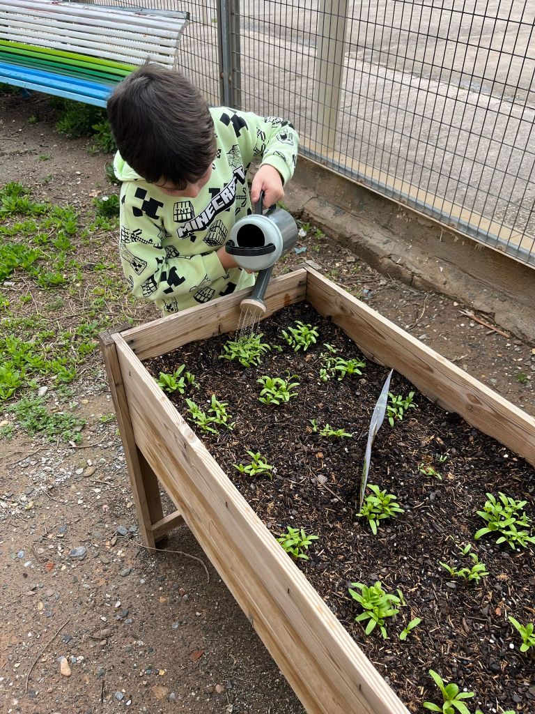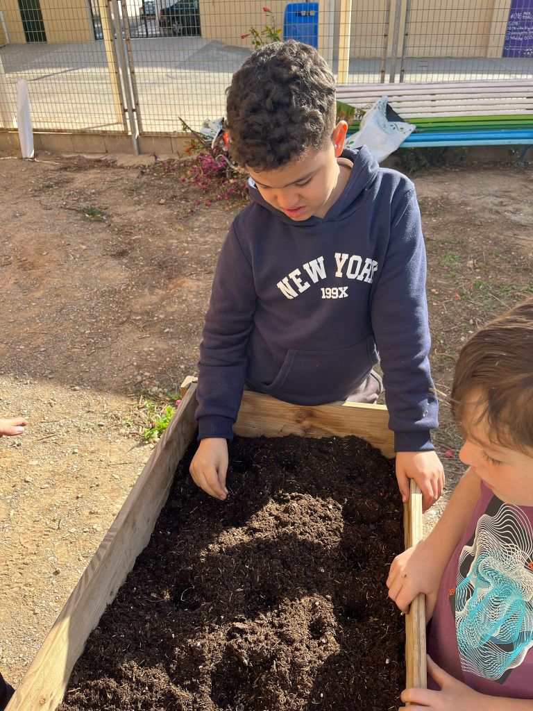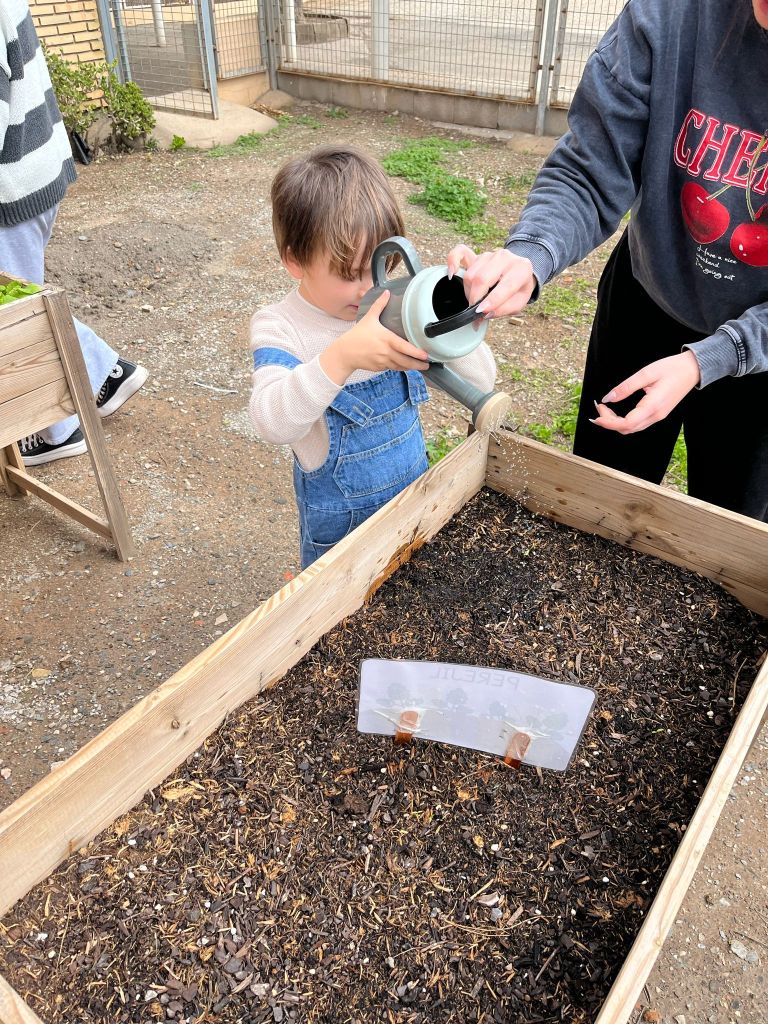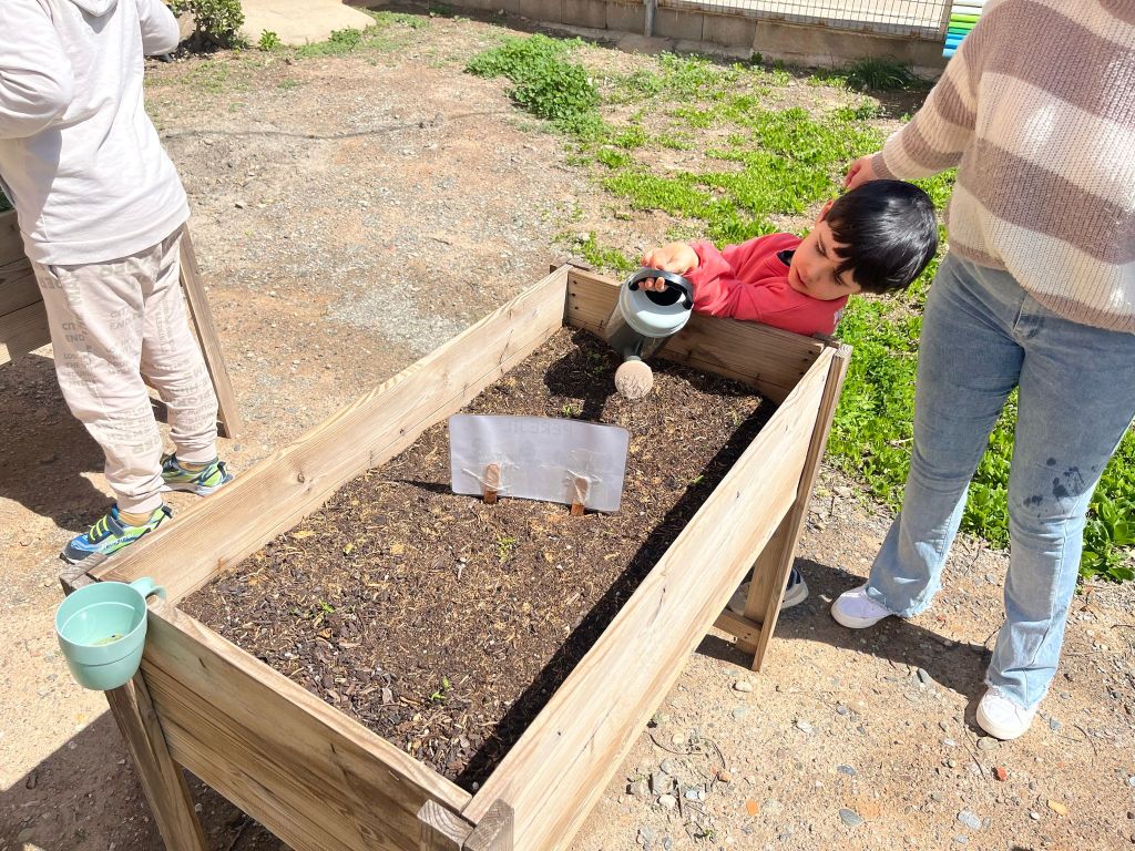 Día 3. Salimos a cuidar nuestro huerto. Las semillas han germinado y comienzan a verse brotes.