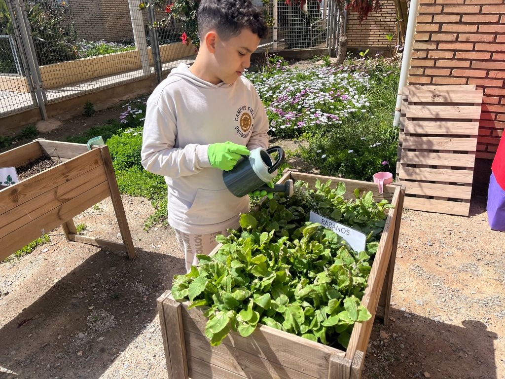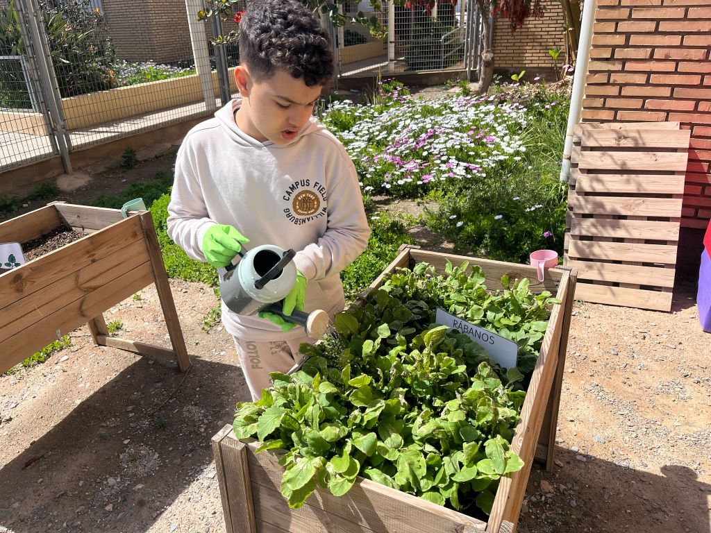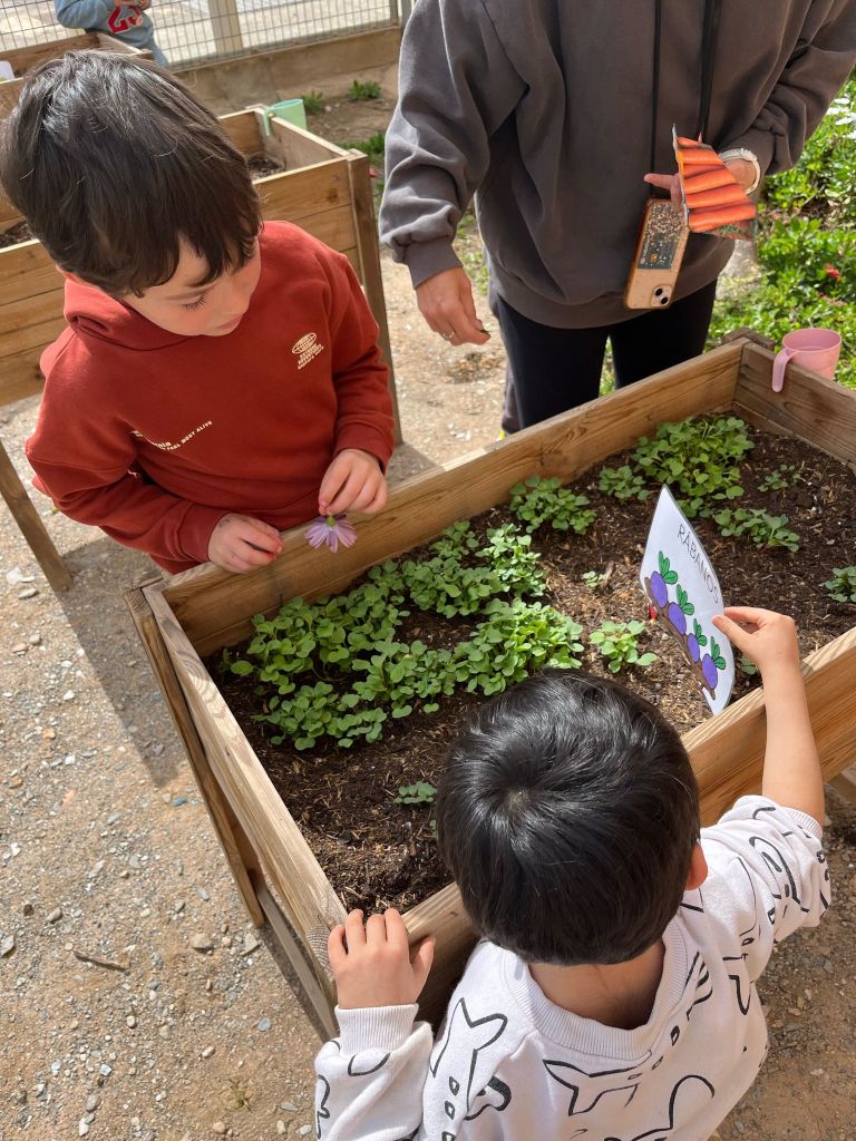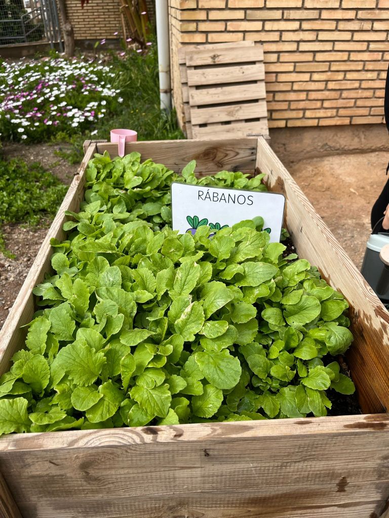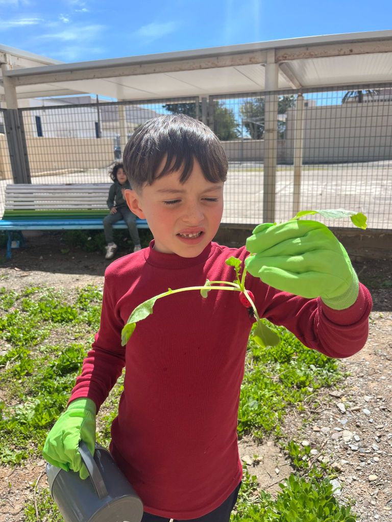 Día 5. Cuidamos el huerto. Los rábanos han comenzado a crecer. Cogemos uno para ver cómo es y dejamos que sigan creciendo.